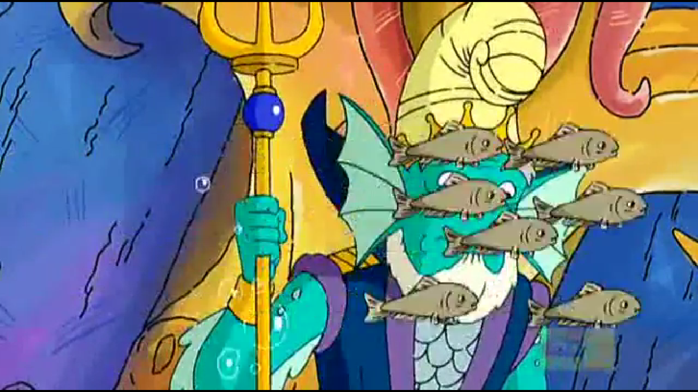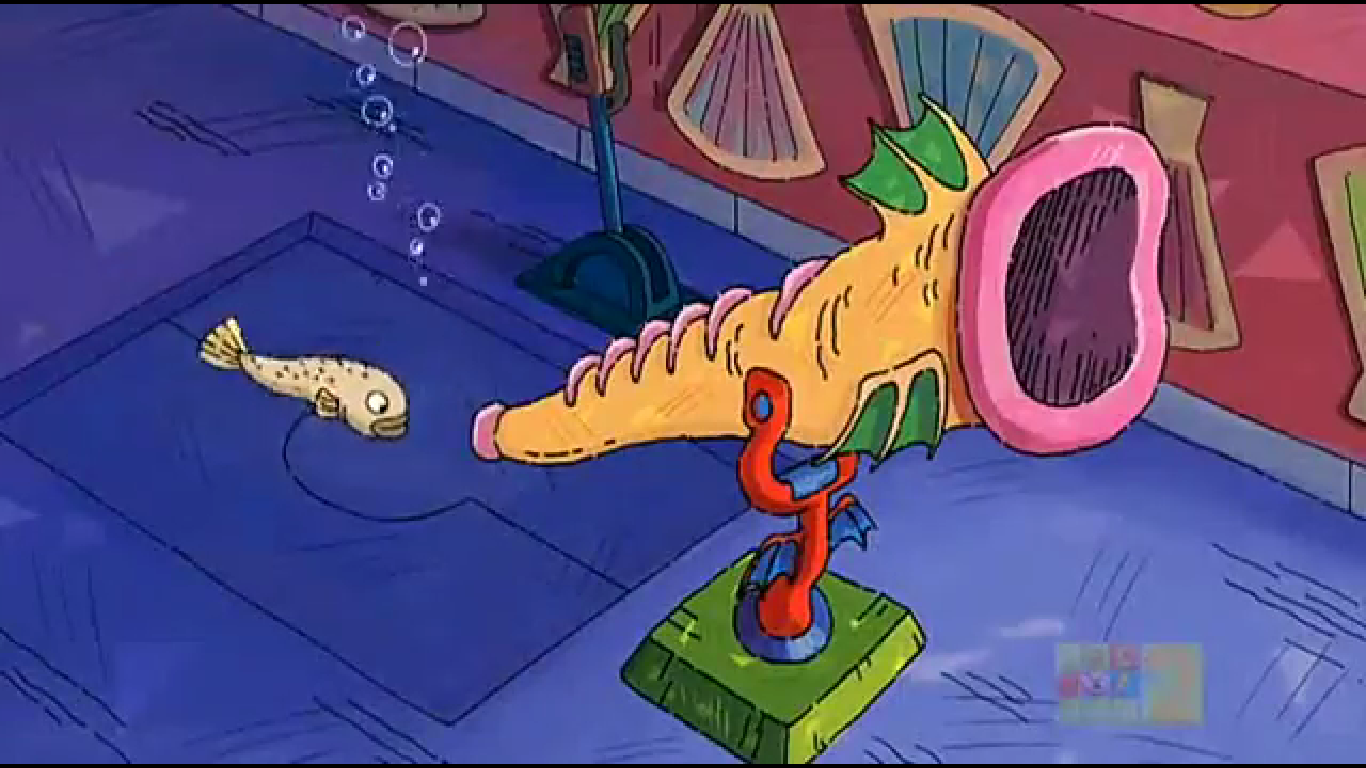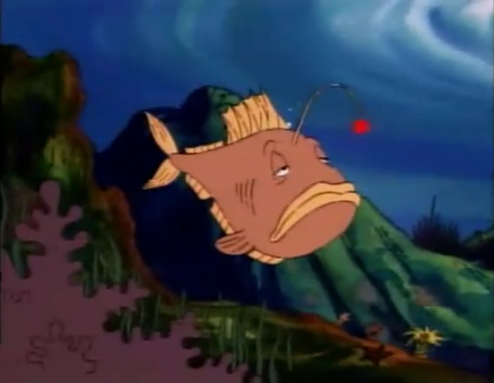 A deep sea fish that lives on the darkest depth of the ocean. It has a long filament spout from the center of its head. This filament produces a light by a biolumment which it has a symbios a with bacteria. Its colors can allow it to hide and catch its prey. It appeared in D.W. Goes to Washington.