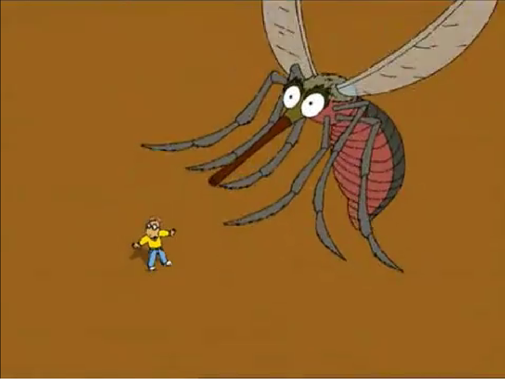 Mosquitoes are a pest to humans. While the both male and female mosquitoes eat mainly fruits and nectar, females drink blood to make eggs when they mate. The female mosquito lays her eggs in stagnant water. Mosquitoes are vectors of diseases. They are eaten by dragonflies, bats and frogs. They are more active after sunset. They made appearance in Bats in the Belfry, and is Francine's project during bug week in Binky Barnes, Wingman.