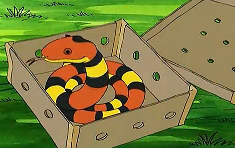 The Kingsnake is a species of snake. The kingsnake constricts its prey, it eats mainly rodents, lizards, eggs and other snakes, their pattern looks similar to that of the coral snake. There is a poem to remember to tell the two species apart. "Red on yellow, kill a fellow; "Red on black, friend of Jack"; and "Red into black, venom lack; red into yellow, kill a fellow." according to Wikipedia. The Kingsnake had major role in the episode Hide and Snake.