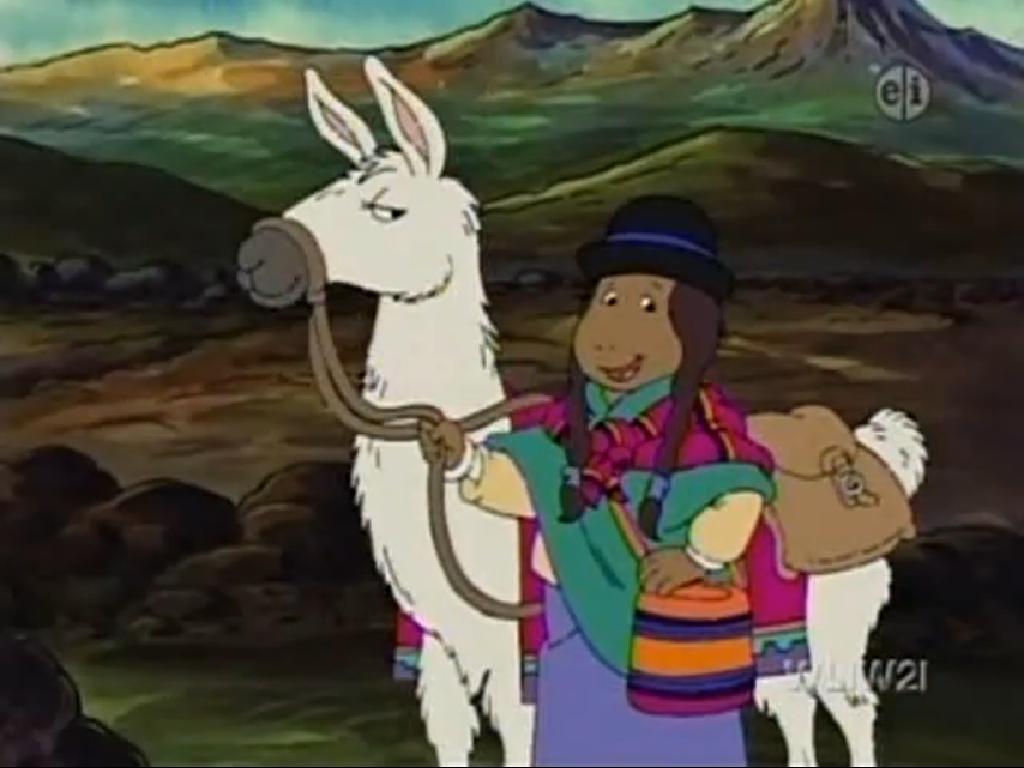 The Llama is a member of the camel family. They are found in the Andes mountains. They mainly eat grass and other shrubs. Their wool is used to make clothes. They have been used as guards of sheep in farms. They make several appearances; once in a postcard from Sue Ellen's pen pal from Bolivia and the other an adviser named Dolly Llama who lives at the Petting Zoo in Elwood city in the episode "Paradise Lost". They are featured prominently in "The Rhythm and Roots of Arthur".