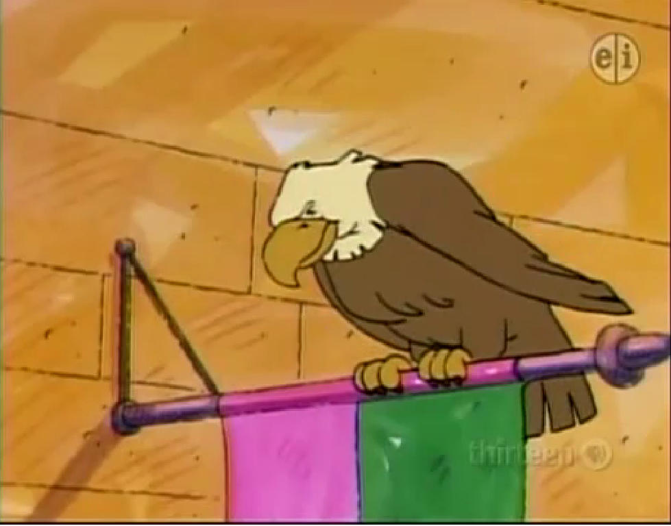 A large predatory bird that hunts fish and other prey. It is the symbol of the United States of America and a bird of honor. As the name is referred to as it is bald, it isn't bald. In fact it has a powerful beak that can cut through the toughest scales and powerful talons that can carry its prey away. As well as strong muscular wings so it can dive for its prey and able to return to the sky. The Bald eagle appeared in I'd Rather Read It Myself as Spanky and mentioned in For the Birds.