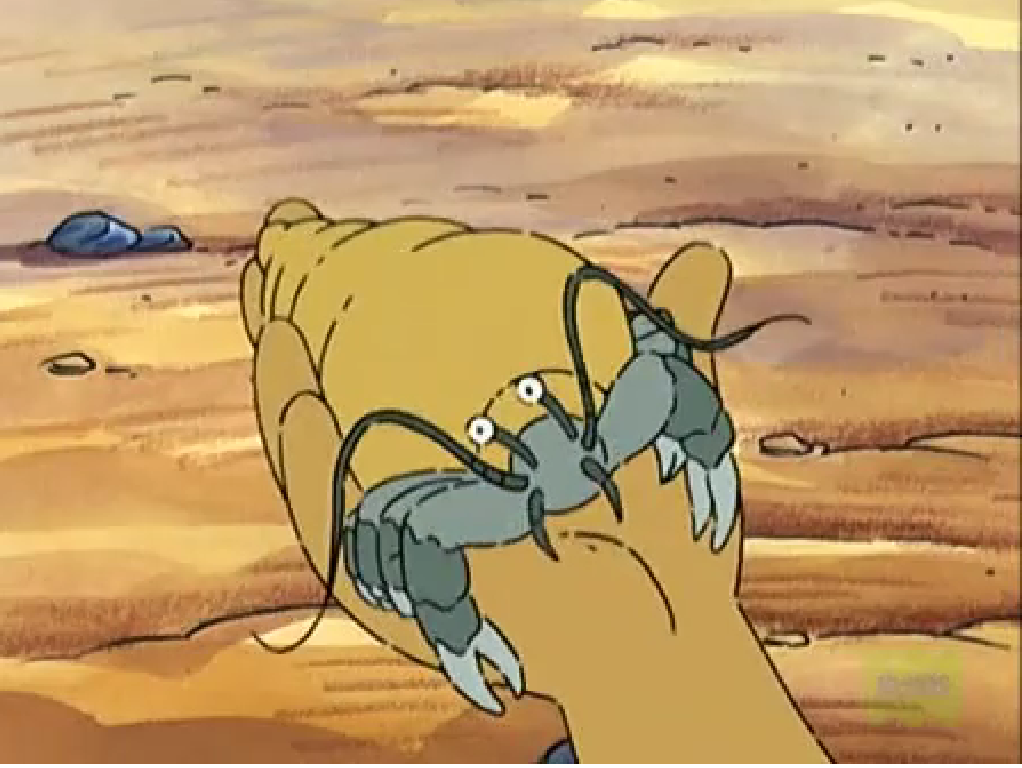 Hermit crabs are a crustacean that live on beaches. They called Hermit Crabs because they wear a shell. They have no armor so as they grow they have to find new shells. They would rather find empty shells, but if they have to they will kill the creature that is living in the shell and take over. They generally eat dead things. They do have two powerful claws. The bigger they are the stronger they pinch. There is other ways for Hermit Crab can defend itself. By placing animals like Urchins on to their shell protects them from predators. D.W. made a mistake for a hermit crab for one her sea shells in The Shore Thing.