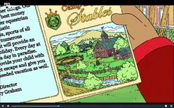 Narrator: At Camp Elysium, the discriminating child will enjoy a well-balanced diet, thrilling sports, the arts, and access to our stable of thoroughbred horses, because every discriminating child should know the rudiments of horse ballet. We hope you’ll consider Camp Elysium, a character-building luxury resort completely free of mosquitoes. Children: And it’s quite fun.