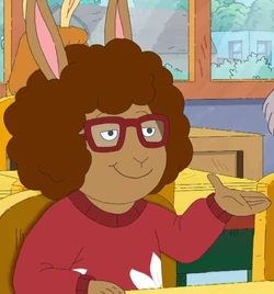 She has dark brown curly hair and wears a maroon sweater designed with large daises, blue jeans, and thick, maroon-framed eyeglasses.