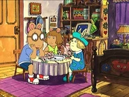 - While Muffy is absent from this episode, her voice is heard in the title card and her last name is seen on the blimp D.W. thinks Omble owns.