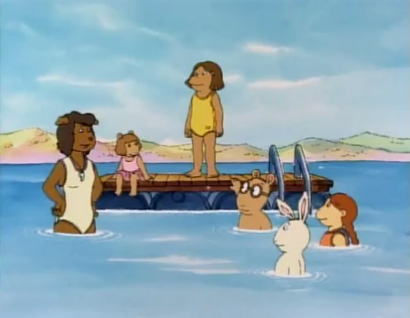 Arthur and Buster are about to run into the water, but Arthur realizes Buster does not have his bathing cap, which he is supposed to wear to protect his ears. Buster says he forgot it, and will have to go home, but then winks (implying he may have accidentally-on-purpose left his cap behind) and they dive into the water. Almost immediately, the lifeguard calls for Buster, and brings him his bathing cap, which his mom had sent over by messenger. Buster reluctantly puts it on, but quickly dives under the water when Francine and Muffy come running up towards him and Arthur. He has to emerge soon, however, to catch his breath.