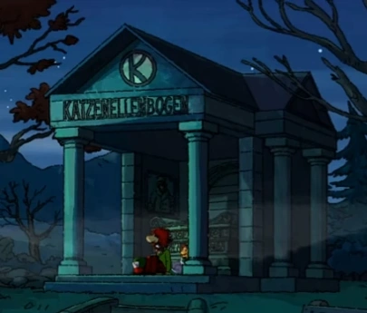 The Elwood City Cemetery is featured in "Arthur and the Haunted Treehouse". Muffy Crosswire and Bailey walk through it and seek shelter from the rain in a memorial that that bears the name Katzenellenbogen (which is the correct German spelling of Katzenellenbogan).