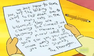 After school, at the Elwood City Public Library Muffy writes a fake eviction letter from the building's manager which states that "the building is about to fall down, due to too many rats in the basement, as they are chewing the cement and becoming a menace." Francine points out that Muffy spelled the word "cement" with an "I" and not with an "E" and Muffy corrects it. The letter ends by stating that "if Mrs. Pariso knows what is good for her, she will move away as soon as she can." Muffy suggests that Francine should spill coffee around the corners in order to make it look more "real".