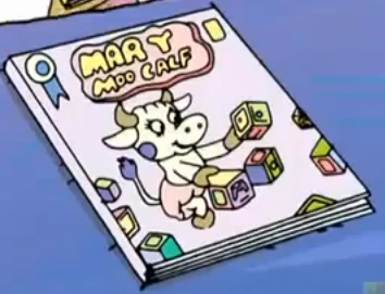 Mary Moo Calf is a fictional comic book seen in a flashback in "Tales of Grotesquely Grim Bunny." It is one of the first comic books D.W. ever picked out. The main character (as well as the overall comic) seems to be the baby variation of Mary Moo Cow.
