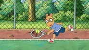 Arthur and Francine are seen playing tennis while Muffy is spectating and writing down everything that happens. Arthur gets annoyed by Muffy's constant typing, even down to things like "Arthur grunts when he serves" and "Now, Arthur is losing his cool." Muffy tells Arthur that he would do better if he could focus on the game instead of on her. Arthur looks to the viewers and groans.