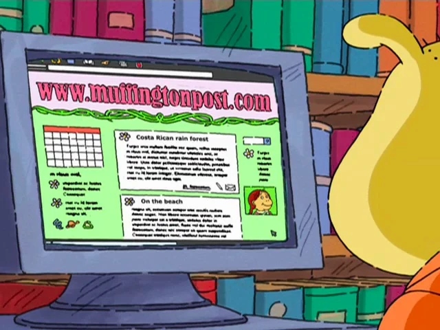 After the title card, Muffy walks into class and announces that she will be going to Costa Rica and posting about it on her blog. Mr. Ratburn does not understand what a blog is, so Brain explains that it is when someone writes their thoughts and posts them on a website for others to read. Muffy states that her blog is called The Muffington Post.