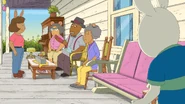 Later that day, more family members arrive, including Theo's cousins Jimmy and Lorraine. Arthur and D.W.'s Aunt Minnie also appears, making her first out of two appearances in the series (the second being in "An Arthur Thanksgiving"). There is another awkward moment, when Arthur and Ryder cannot agree on what sort of sausages to grill first. They end up making both kinds (sweet and spicy). Buster also has his own awkward moment, as none of Arthur's relatives know who he is because he is not biologically related to the family. D.W. also finds trouble making conversation with the grown-ups, as they barely notice her. She later annoys the grown-ups when she tries to catch a lizard with the peanut bowl. Since no one has time for her, she decides to leave, as nobody seems to care about or notice her.