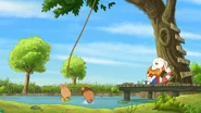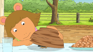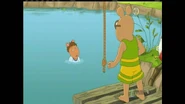 Buster joins Arthur and Ryder who swing on a rope to jump into the pond. Buster uses too much momentum and hurts his foot when he lands on the dock (instead of in the lake like he was supposed to).