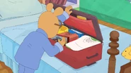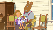 The family give Theo their presents. Since Buster’s present was lost with his bag, he picks some flowers and puts them in the old soda bottle he found under the bed. Theo is delighted, because the bottle reminds him of his childhood. He dubs Buster an honorary member of the family. Then they realize that D.W. is missing.