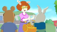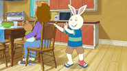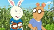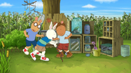 Buster wakes up early in the morning and goes into the kitchen where Miles is baking for the birthday lunch. He has made rhubarb muffins and a pie (he does not specify what kind of pie he has made, but we can assume it is made with rhubarb as well). D.W. is woken by the lizard and runs inside screaming. She finds Arthur in her bed and throws him out. Arthur notices that Ryder has not opened the box with the toy plow.