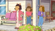 The next morning, Mr. Read gets the car ready. Thora brings homemade peanut butter and pickle sandwiches, to D.W.’s disgust. When D.W. learns that her mom will not come with them because Kate is sick, D.W. does not want to go either. Her mom convinces her to change her mind by telling her that her cousins in Ohio live on a llama farm. Mrs. Baxter drops off Buster who is accompanying the Reads.